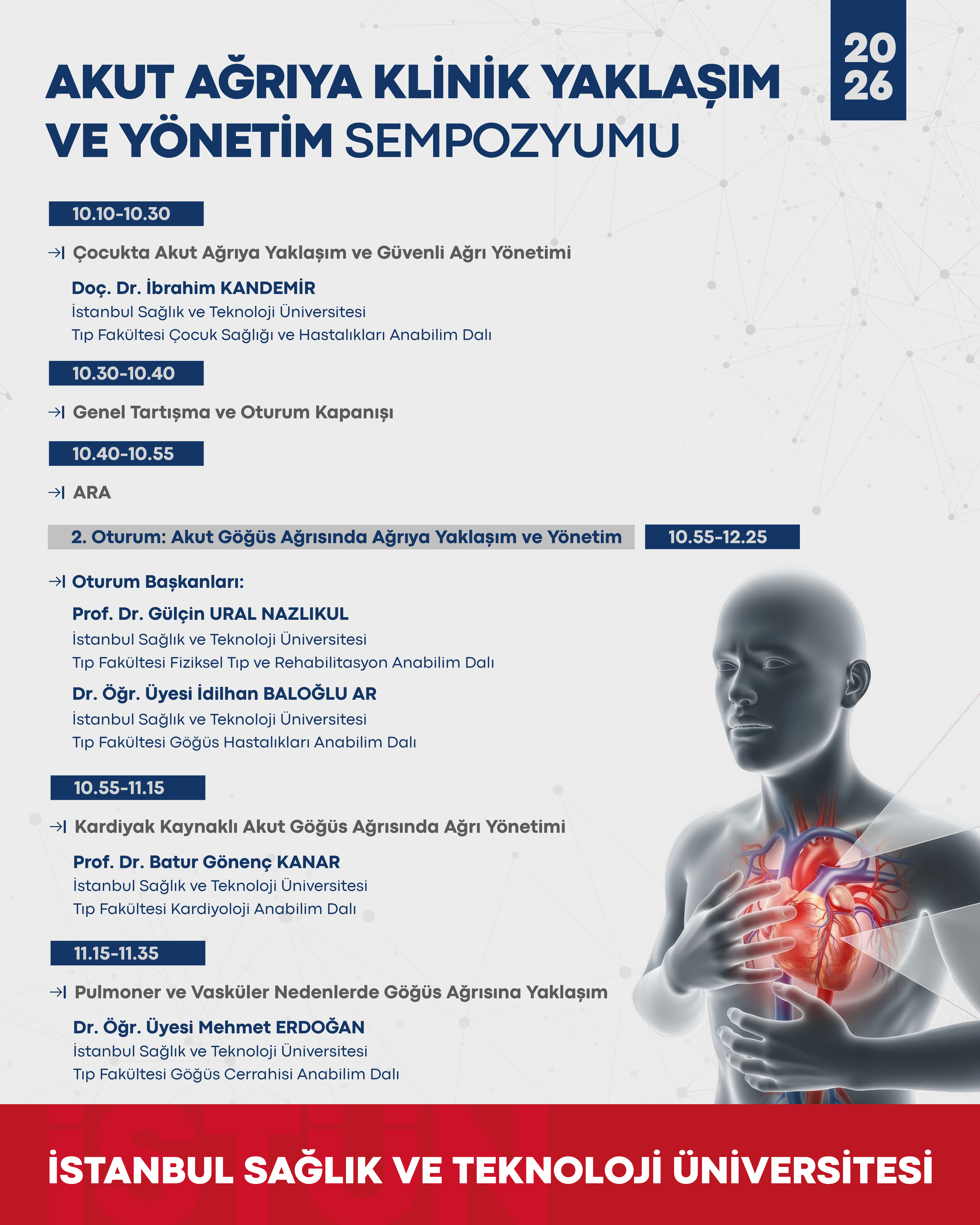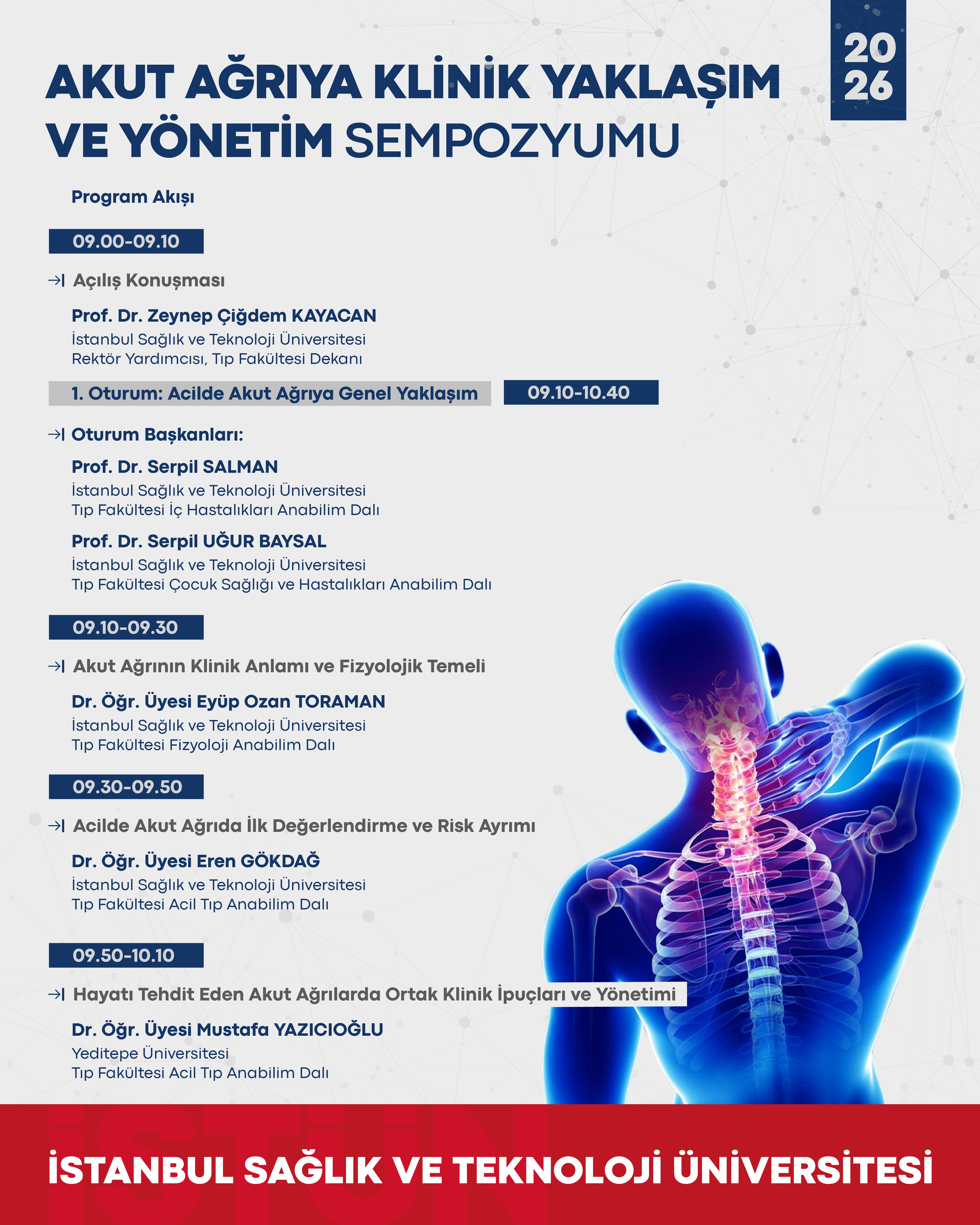 Akut ağrı, yalnızca bir semptom olmanın ötesinde, altta yatan ciddi hastalıkların ilk belirtisi olabilmesi nedeniyle zamanında ve doğru değerlendirilmesi hayati önem taşımaktadır. Bu sempozyumda; akut ağrının fizyolojik temellerinden başlayarak klinik değerlendirme yöntemleri, tanısal yaklaşımlar ve güncel tedavi stratejileri kapsamlı bir şekilde ele alınacaktır.