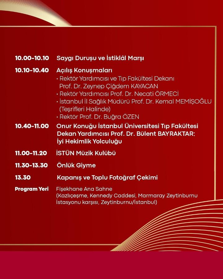 İSTÜN Tıp Fakültesi 2023-2024 Akademik Yılı Önlük Giyme Töreni, 19 Nisan 2024 tarihinde Fişekhane’de düzenlenecektir.Katılımınız bizleri onurlandıracaktır.