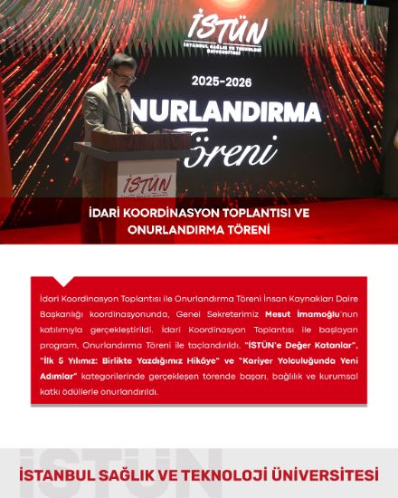 Program, “Birlikte Daha Güçlüyüz” mesajıyla tamamlanırken; üniversitemizin gelişim yolculuğunda idari kadronun üstlendiği önemli rol bir kez daha vurgulandı. İstanbul Sağlık ve Teknoloji Üniversitesi olarak, kurum kültürümüze değer katan tüm çalışma arkadaşlarımıza teşekkür ediyor; birlikte üretmeye ve birlikte gelişmeye devam edeceğimize inanıyoruz.