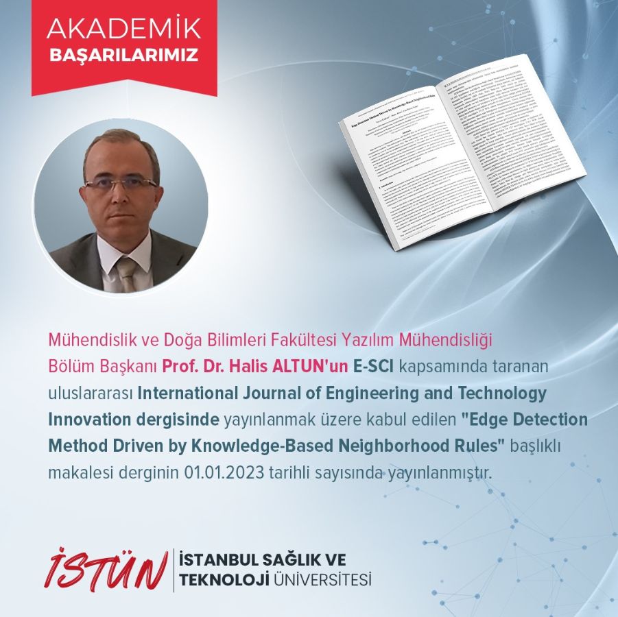 Mühendislik ve Doğa Bilimleri Fakültesi Yazılım Mühendisliği Bölüm Başkanımız Prof. Dr. Halis ALTUN'un E-SCI kapsamında taranan uluslararası International Journal of Engineering and Technology Innovation dergisinde yayınlanmak üzere kabul edilen " Edge Detection Method Driven by Knowledge-Based Neighborhood Rules" başlıklı makalesi derginin 01.01.2023 tarihli sayısında yayımlanmıştır.